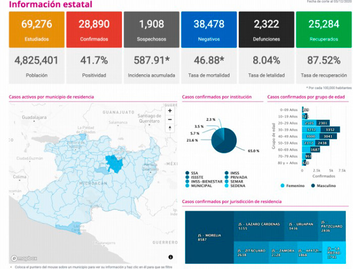 Michoacán registra 134 nuevos casos de COVID-19 y 9 defunciones, llegando así a los 28 mil 890 casos y 2 mil 322 personas que han perdido la vida en la batalla contra la pandemia estos 8 meses.