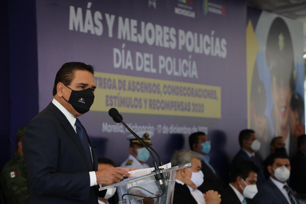 «La responsabilidad de la Policía se ha visto reflejada en mantener acciones firmes para brindar la seguridad en los 113 municipios. En este año se han enfrentado otros retos donde la vocación de servir ha quedado clara al llevar a cabo la entrega de más de 258 mil despensas, como parte del programa Michoacán Alimenta y las labores de proximidad social para evitar mayores contagios de la pandemia que hoy vivimos”, recordó.