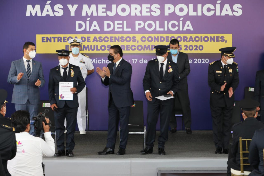 La Policía Michoacán continúa transformándose y cada día fortalece su identidad, señaló el Gobernador Silvano Aureoles Conejo durante la entrega de ascensos, condecoraciones, estímulos y recompensas 2020, en el marco del Día del Policía.