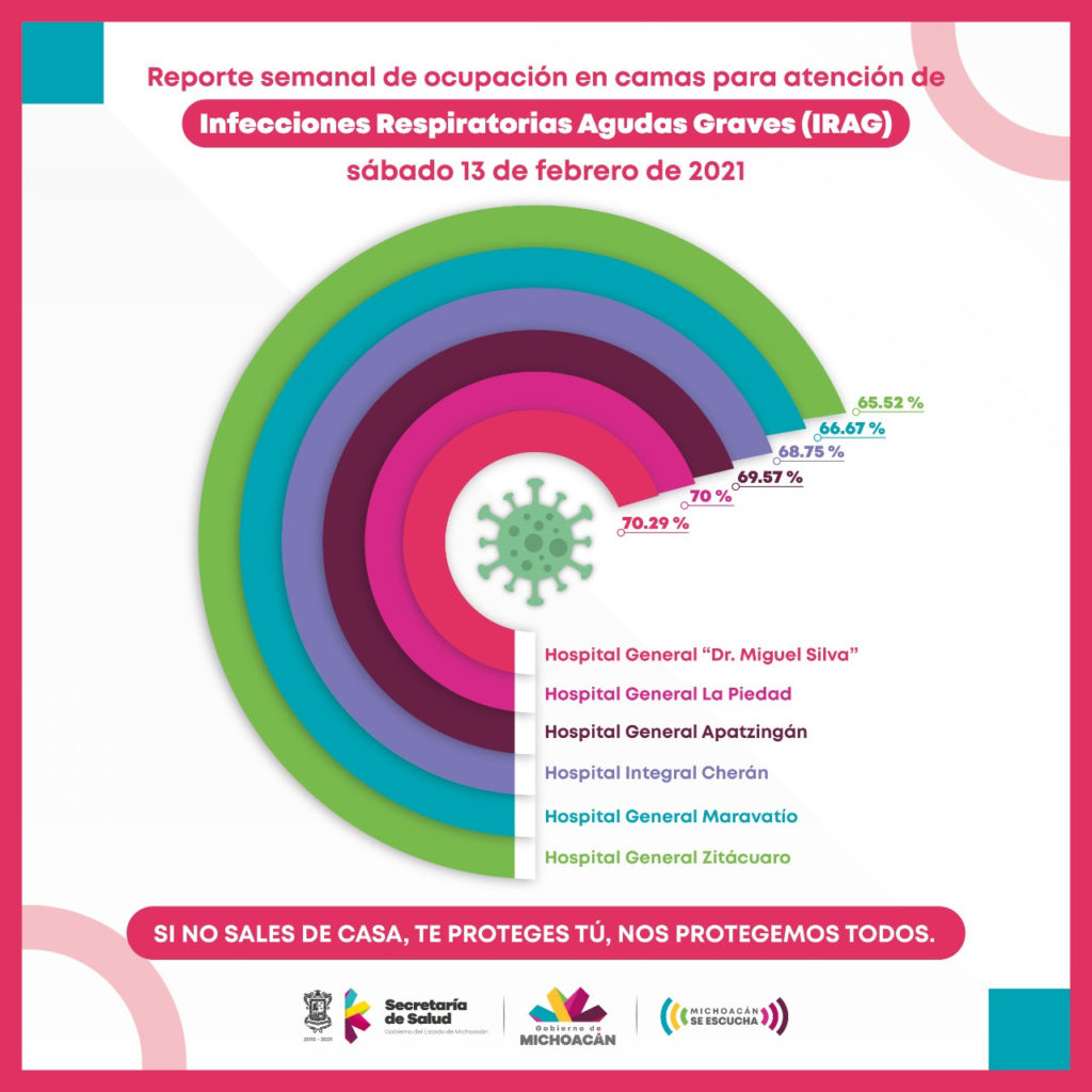 Los hospitales con camas reconvertidas para la atención de Infecciones Respiratorias Agudas Graves (IRAG), de la Secretaría de Salud de Michoacán (SSM), se encuentran por debajo del 70.29 por ciento de su capacidad.