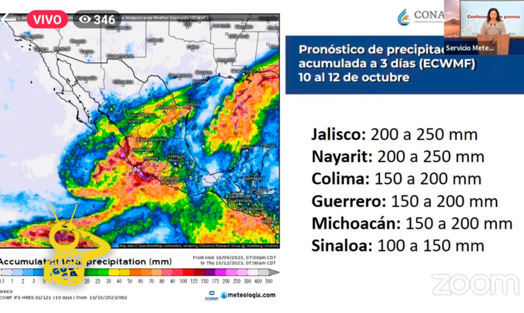 «Se esperan lluvias torrenciales en Nayarit, Jalisco, Colima, Michoacán y Guerrero; además de vientos de 100 a 120 km/h y oleajes de 3 a 5 metros en las costas de Colima y Michoacán», advirtieron los especialistas, con datos del Sistema Meteorológico Nacional (SMN).