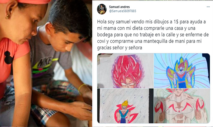 “Hola soy samuel vendo mis dibujos a 1$ para ayuda a mi mama con mi dieta comprarle una casa y una bodega para que no trabaje en la calle y se enferme de covi y comprarme una mantequilla de mani para mi gracias señor y señora”, indica el pequeño en su tuit, el cual acompaña con varios de sus dibujos.