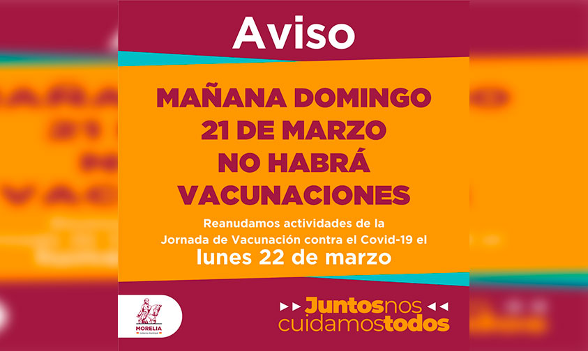 Con el fin de informar a la población, el Gobierno de Morelia recuerda a los adultos mayores que la jornada de vacunación en el municipio se reanudará hasta el próximo lunes 22 de marzo.