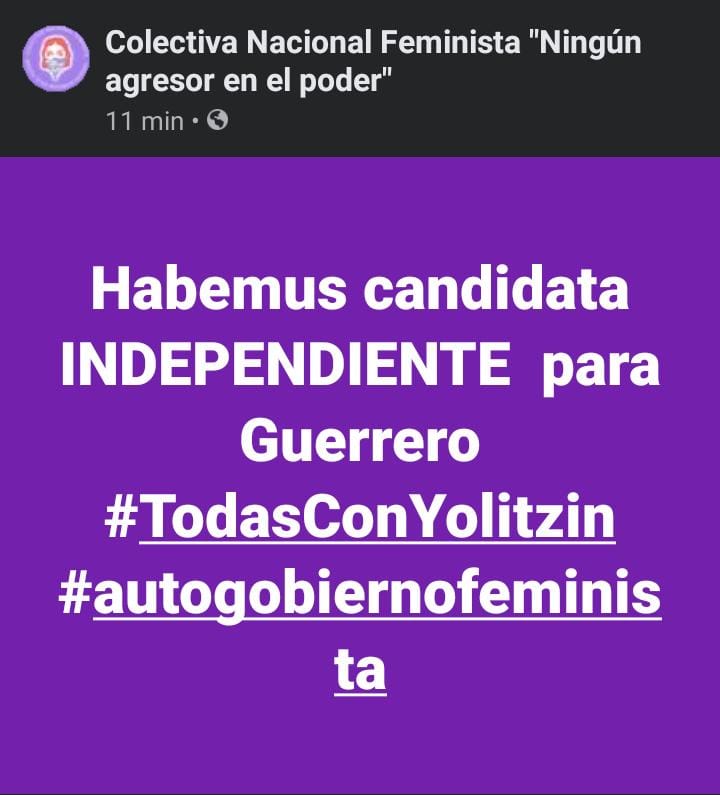 En una rueda de prensa virtual la Colectiva Nacional Feminista “Ningún agresor en el poder” (CONAFEM), se anunció a Yolitzi Jaimes Rendón como candidata independiente por la gubernatura de Guerrero, como oposición contra Feliz Salgado Macedonio y con una propuesta de «autogobierno feminista».