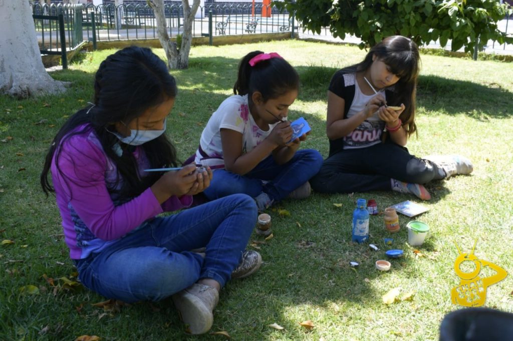 A la clase de este domingo fueron en su mayoría niñas, las que trabajaron con imágenes de las comunidades p’urhépechas. Malu recortó y pegó los paisajes en unos pequeños cuadros de madera, para que las niñas reprodujeran las imágenes. ¿Qué color es este?, ¿Qué color pongo aquí?, ¿Malu me prestas un pincel más chiquitito? Son algunas de las preguntas que se escucharon en voz de las pequeñas que estuvieron trabajando el día de hoy en el taller.