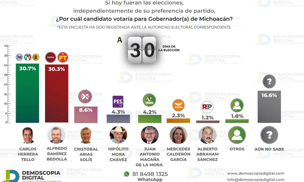 Lo anterior, de acuerdo a una encuesta realizada por Demoscopia Digital a 30 días para la elección del 6 de junio, en donde Carlos Herrera obtuvo una intención de voto del 30.7 por ciento, una ligera mayoría frente a Alfredo Bedolla quien obtuvo un 30.3 por ciento.
