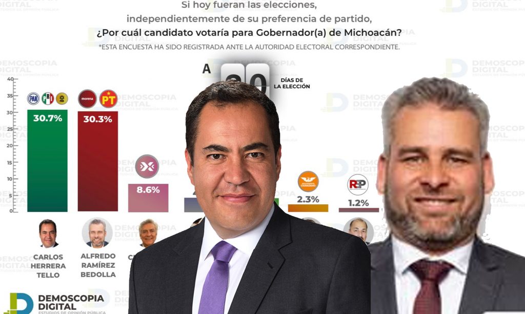 Si hoy fueran las elecciones en Michoacán, se daría prácticamente un empate entre Carlos Herrera Tello, candidato del Equipo por Michoacán (PRI, PAN y PRD) y Alfredo Ramírez Bedolla de Morena.