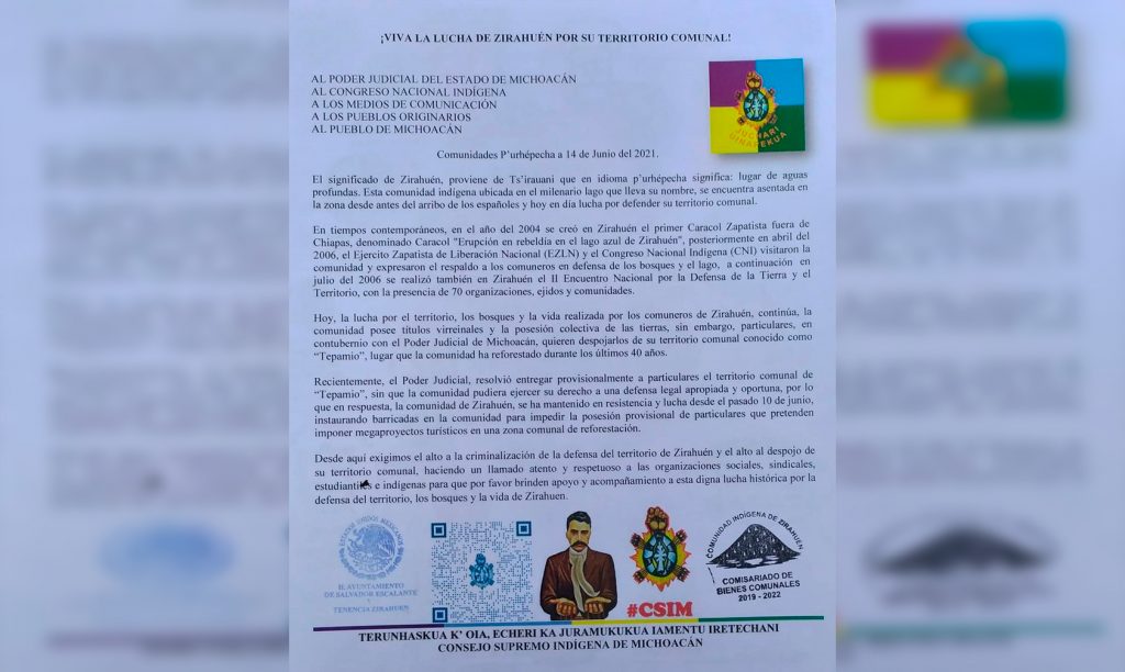 Declararon que el día de hoy, la lucha por el territorio, los bosques y la vida realizada por los comuneros de Zirahuén, continúa, argumentaron que la comunidad posee títulos virreinales y la posesión colectiva de las tierras, sin embargo, denunciaron públicamente que particulares en contubernio con el Poder Judicial de Michoacán, pretenden despojarlos de su territorio comunal conocido como “Tepamio”, lugar que la comunidad ha reforestado durante los últimos 40 años.