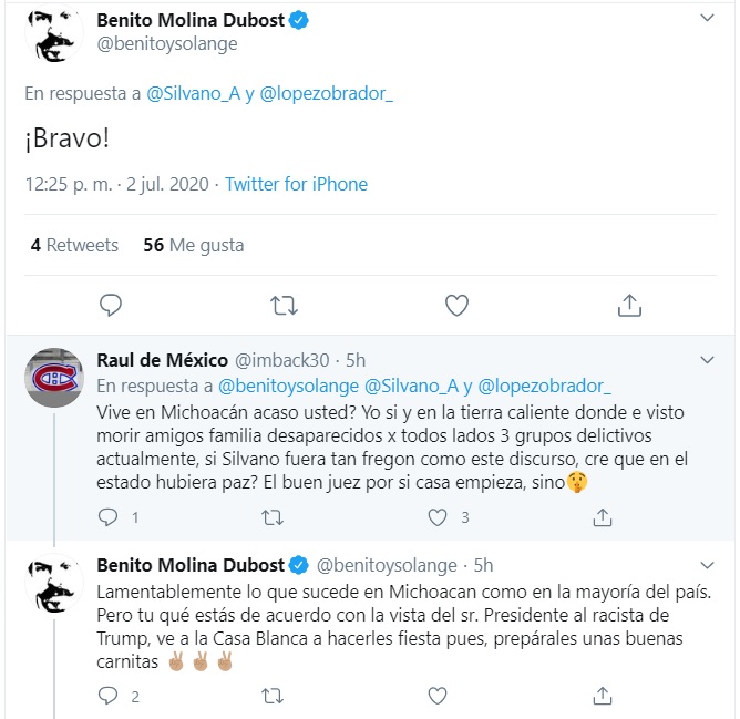 Por su parte el moreliano Felipe Calderón fue más “corto” en su mensaje al mismo tiempo que compartió el video de Aureoles Conejo “Fuerte, el mensaje de @Silvano_A”; en tanto que el Chef Benito exclamó un “¡Bravo!” el cual fue refutado por uno de sus seguidores quien le reclamó si acaso conocía la situación de inseguridad y violencia que vive Michoacán, como para respaldar el mensaje de Silvano, a lo cual el cocinero respondió: