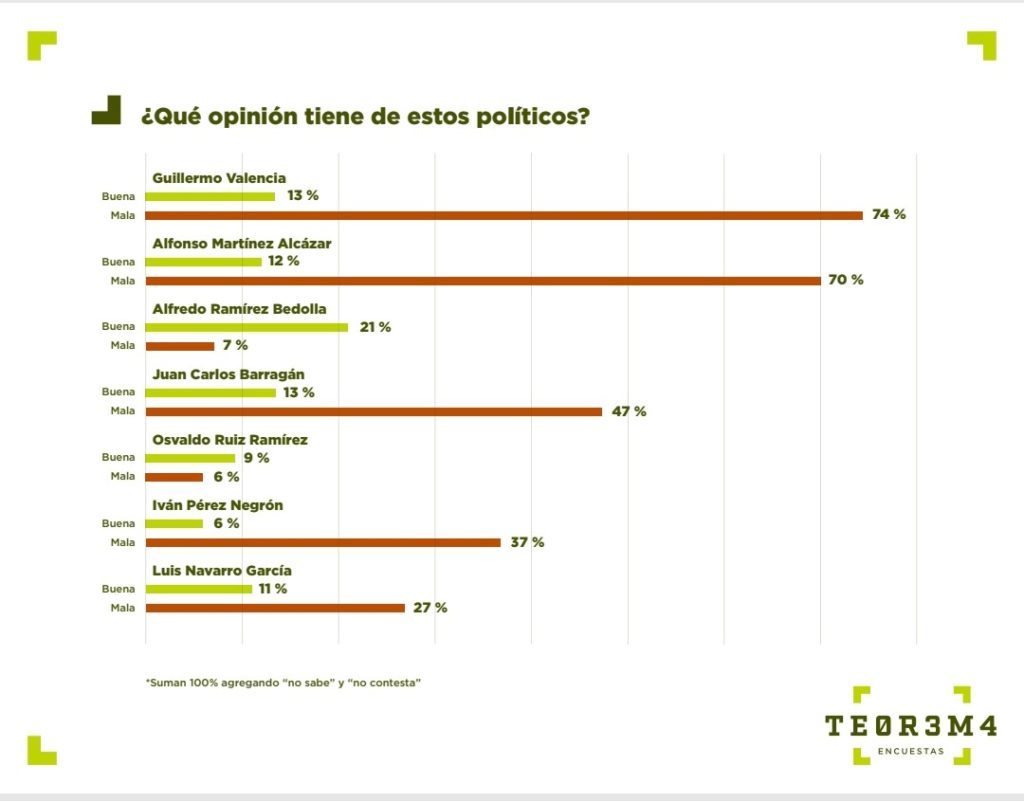 El priista Guillermo Valencia es el menos confiable, ya que tiene una percepción negativa de 74 por ciento, y positiva de 13 por ciento.
