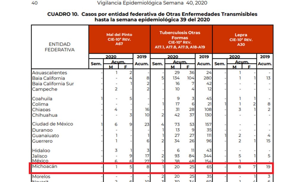 De acuerdo con la información de la Vigilancia Epidemiológica en el cuadro 10 de casos por entidad federativa de Otras Enfermedades Transmisibles hasta la semana epidemiológica 39 del 2020, Michoacán cuenta con 15 casos confirmados de lepra, de los cuales 8 son en hombres y 7 en mujeres.