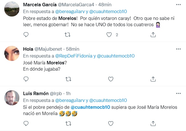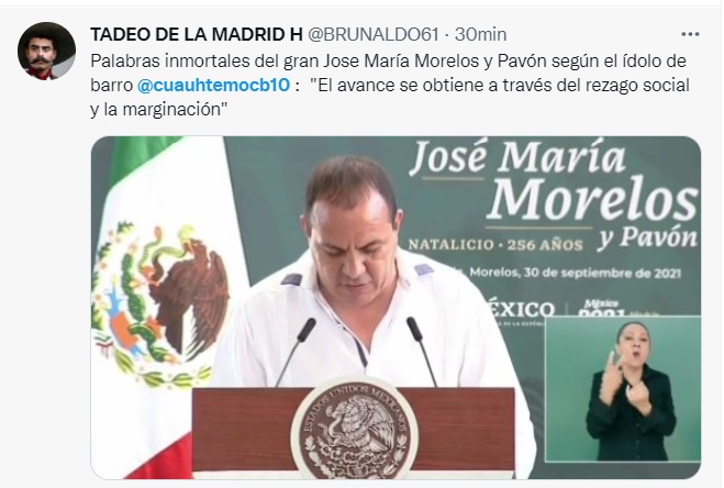 Y pues las redes sociales no perdonaron esta parte del discurso del gobernador Blanco volviéndose tendencia, siendo que algunos usuarios recordaron el desliz que tuvo en 2016, cuando aún era alcalde de Cuernavaca y agradeció a Benito Juárez de ser invitado a una escuela primaria del mismo nombre.