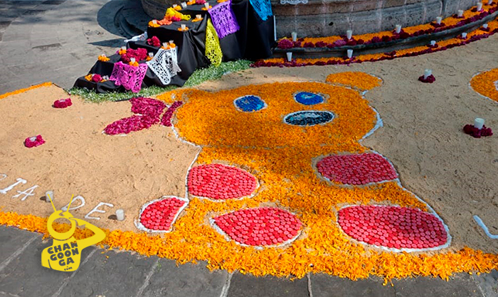 La fuente de la plaza es el lugar donde se colocó está ofrenda, una figura de un oso resalta entre todos los elementos, está hecho a base de pétalos de cempasúchil y tapitas de refresco. Al centro del altar también mariposas, estas figuras son típicas en los altares de la noche de animas.