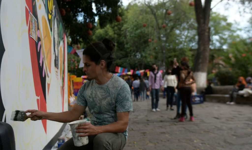 En un bastidor de más de 2 metros, con algunos botes de pintura y un plástico que cubre el piso de cantera de la Calzada Fray Bernardino de Sahagún, o de San Diego, como normalmente lo conocen los morelianos, está Quetzal Fuerte, pintando un mural, mientras que los morelianos transitan por el lugar, dónde se han colocado ofrendas tradicionales para conmemorar la noche de ánimas.