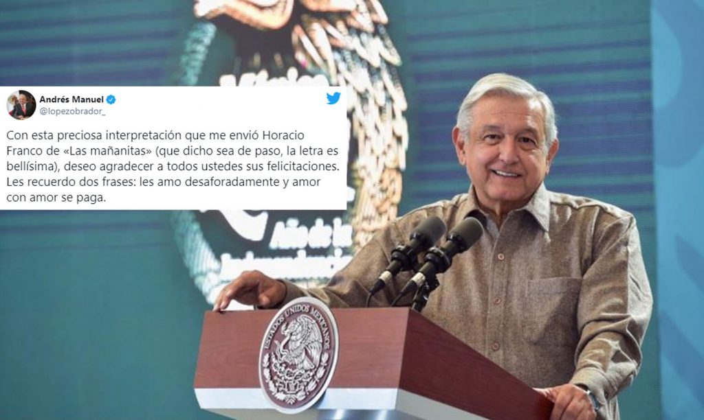 AMLO compartió un pedacito de “Las Mañanitas” que le interpretó el flautista Horacio Franco, para dar gracias a cada una de las personas que le han dedicado algunas palabras por su cumple, y dijo que amor con amor se paga.