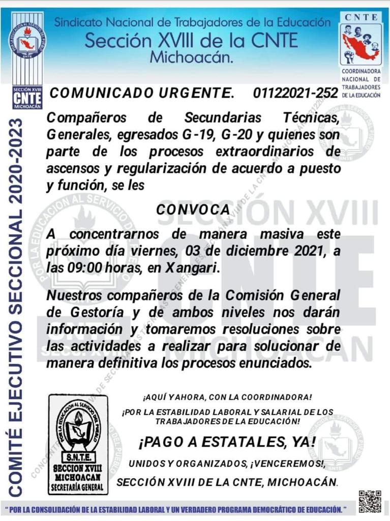 A través de un comunicado, la CNTE azul, ha señalado que se concentraran de manera masiva en punto de las 9 horas de la mañana en Xangari, para determinar qué actividades realizan para solucionar las problemáticas del magisterio michoacano.
