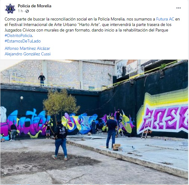 “Como parte de buscar la reconciliación social en la Policía Morelia, nos sumamos a Futura AC en el Festival Internacional de Arte Urbano “Harto Arte”, que intervendrá la parte trasera de los Juzgados Cívicos con murales de gran formato, dando inicio a la rehabilitación del Parque #DistritoPolicía.”, señala la publicación acompañada por las fotos.