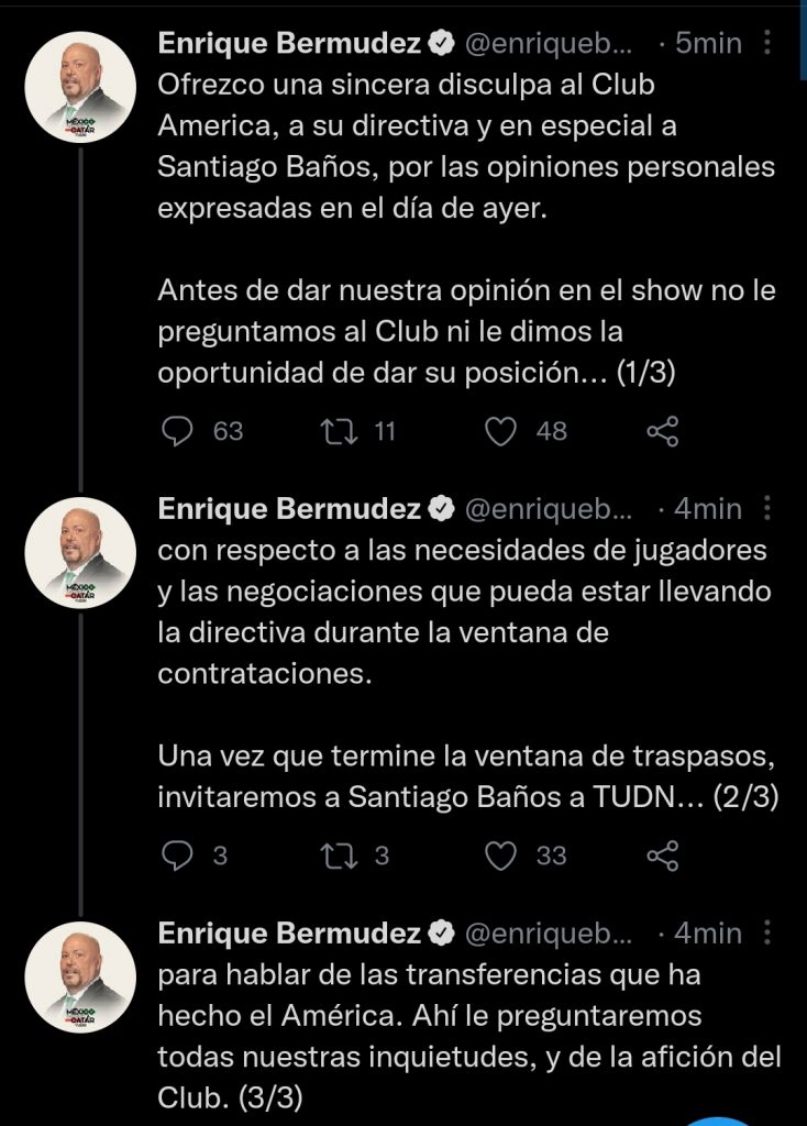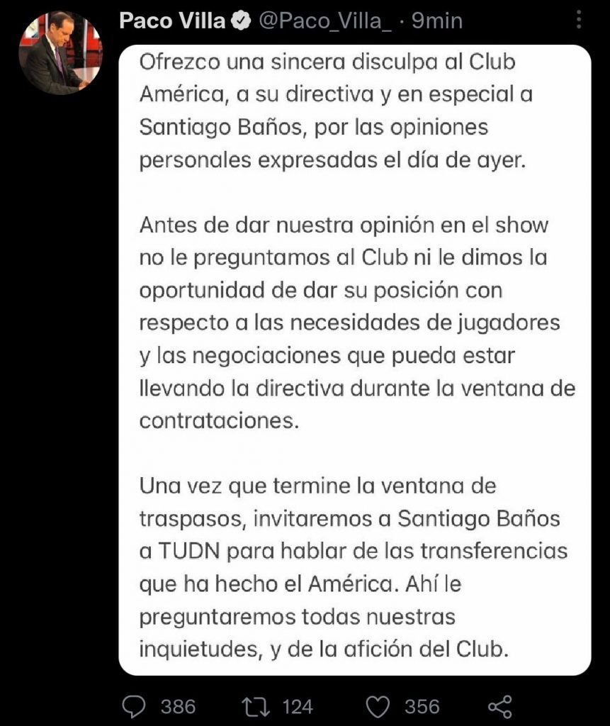 “Ofrezco una sincera disculpa al Club América y a su directiva y en especial a Santiago Baños por las opiniones personas expresadas el día de ayer”, indica el mensaje de ambos comentaristas, así, igualito.