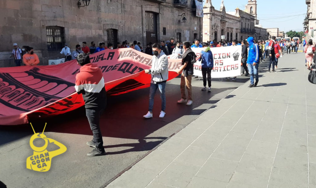 Un gran contingente de estudiantes de la escuela Normal Rural de Tiripetío «Vasco de Quiroga», marcharon esta mañana desde el obelisco a Lázaro Cárdenas de Morelia, hacia Palacio de Gobierno, acusan persecución política en su contra.