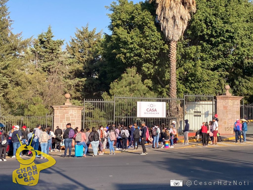 Integrantes de la Sección XVIII de la Coordinadora Nacional de Trabajadores de la Educación (CNTE) se congregan esta mañana en las inmediaciones de Casa Michoacán, en la ciudad de Morelia.