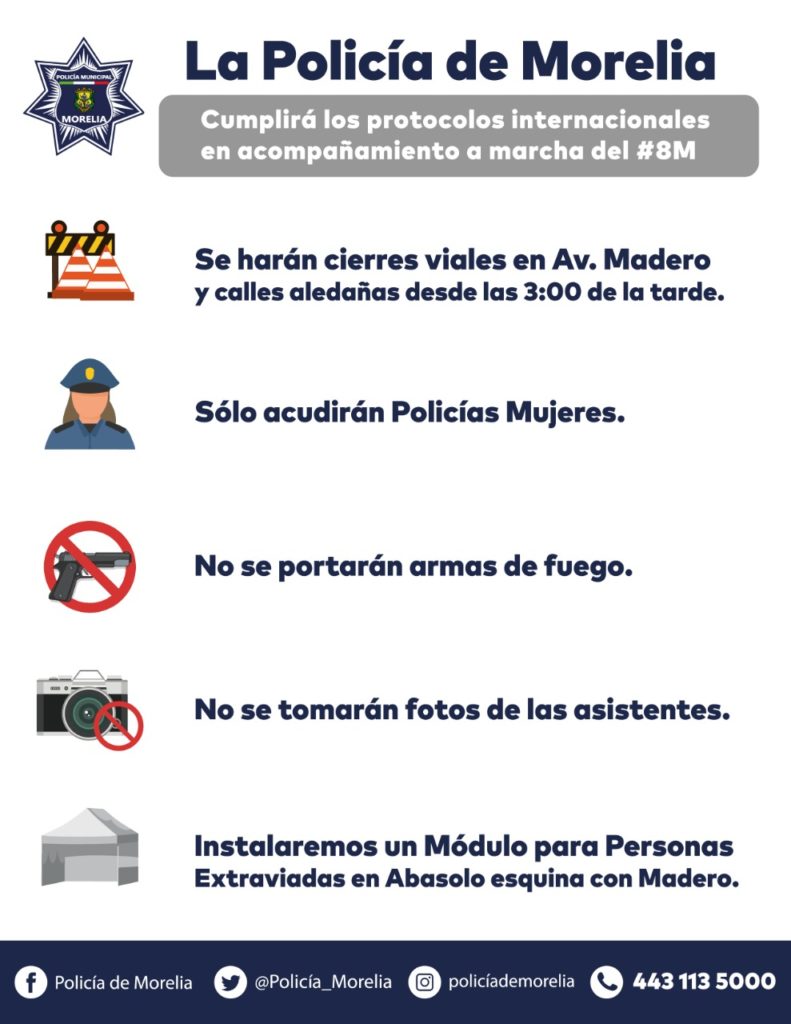 Con el objetivo de respetar la libre manifestación y salvaguardar la paz pública, la Policía de Morelia cumplirá a cabalidad el protocolo internacional para la marcha de mujeres del 8 de marzo, cuya participación se centra en acompañar esta manifestación para garantizar la seguridad de todas las personas.