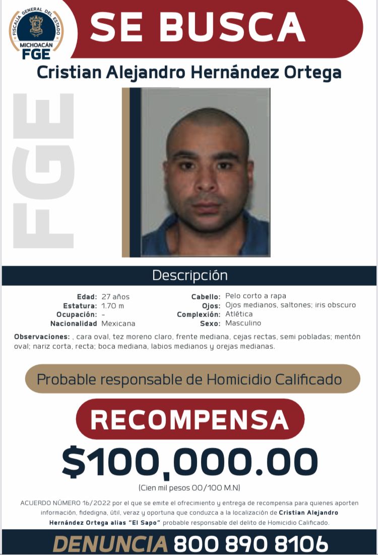 El titular de la FGE apuntó que por lo anterior y con fines de localización y cumplimentación del mandamiento de captura, la Fiscalía General del Estado de Michoacán hace público el acuerdo de recompensa y las cédulas de identidad de las siguientes personas: