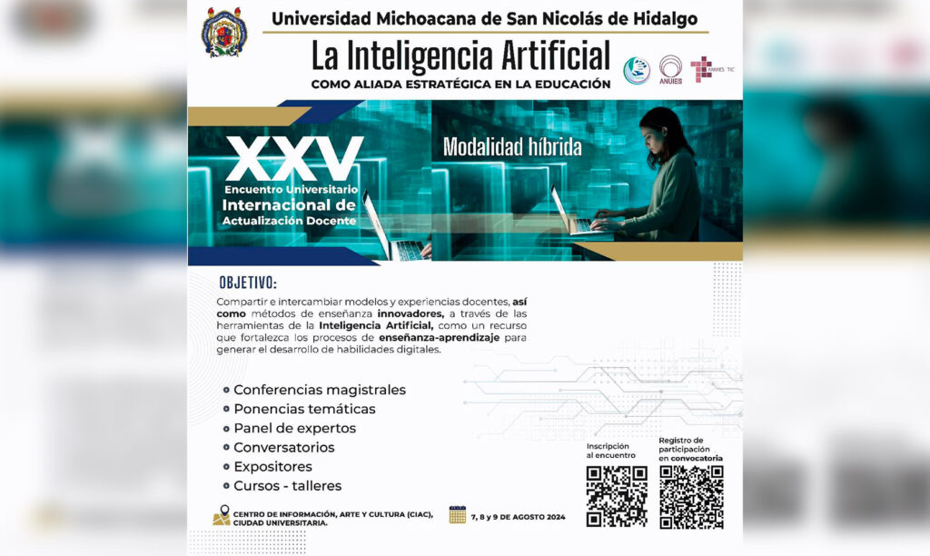 Con un tema innovador y acorde a los tiempos actuales, la Universidad Michoacana de San Nicolás de Hidalgo (UMSNH) será sede el próximo mes de agosto del XXV Encuentro Universitario Internacional de Actualización Docente, “La Inteligencia Artificial como aliada estratégica en la Educación”.