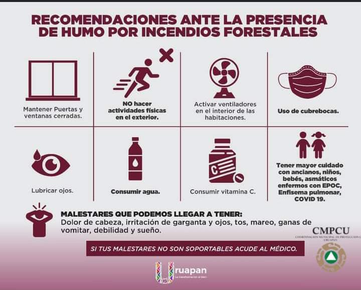 Ante la concentración de humo generada por los incendios forestales registrados en los últimos días en la ciudad de Uruapan y en diferentes municipios de los alrededores, el Gobierno del Bien, a través de la Coordinación Municipal de Protección Civil, emitió una serie de recomendaciones a la ciudadanía para evitar afectaciones en la salud de las personas por la contingencia ambiental.