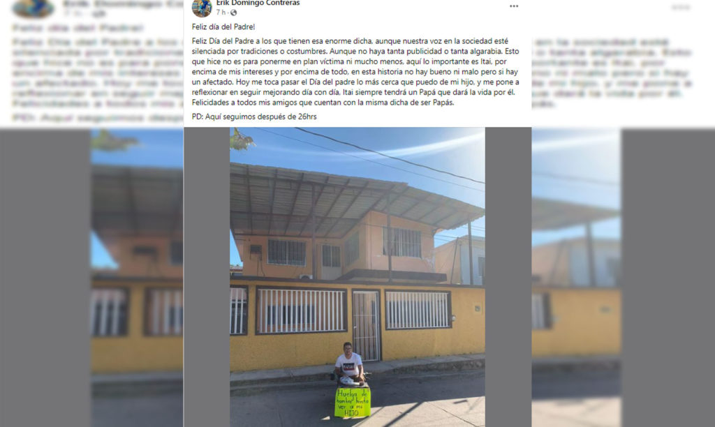 Este día del padre, Erik lo inició sentado en una mesa con una cartulina fosforescente en la que se lee “huelga de hambre hasta ver a mi hijo”, publicación en la que en comentarios denunció que un tío de su hijo fue a burlarse de él.