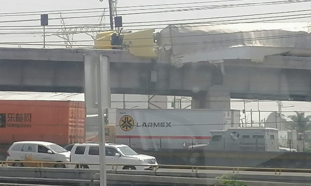 En redes sociales se ha viralizado un video en el que se muestra que un tráiler “pende de un hilo”, luego de que se volcara en la incorporación del Circuito Exterior Mexiquense hace la autopista México – Querétaro y quedara “recostado” sobre un puente vehicular.