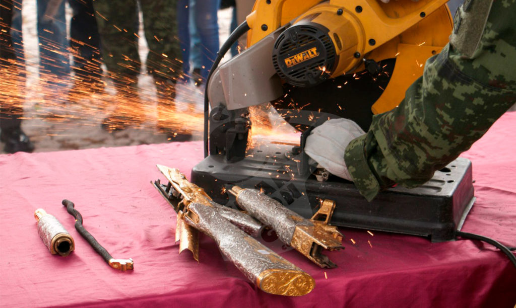 Entre el decomiso que se será destruido se encontraban fusiles con decoración personalizada, algunos color dorado, otras pistolas con cachas con nombres, algunos con adornos muy excéntricos.