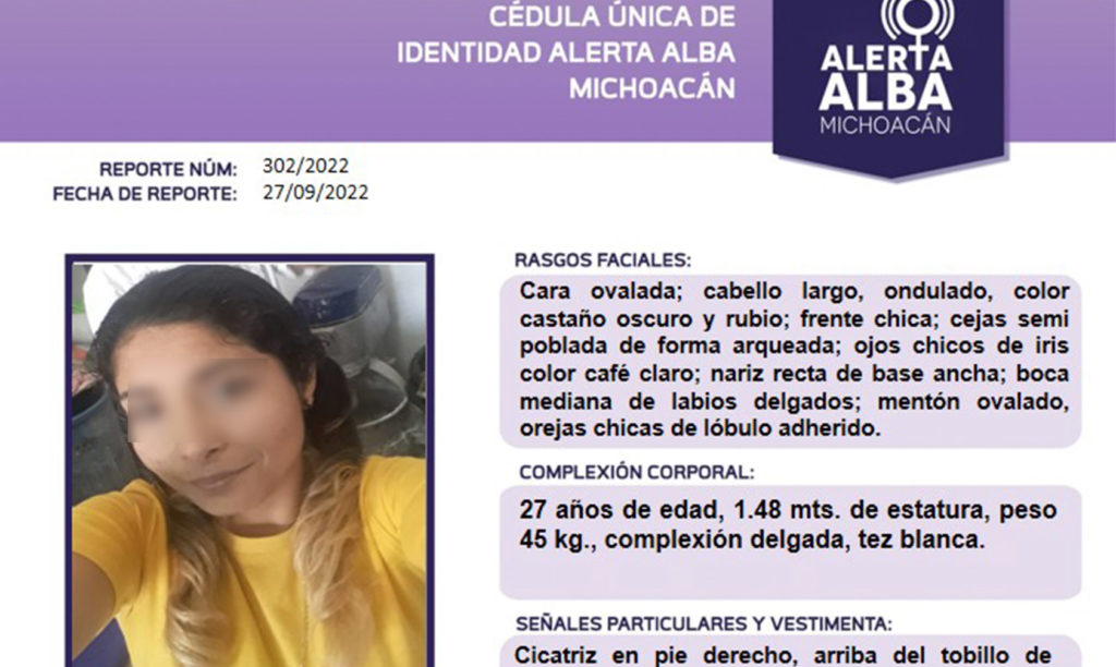 El pasado martes 27 de septiembre, familiares de la mujer presentaron la denuncia correspondiente por la desaparición, en virtud de que desde el día 24 fue vista por última vez en el fraccionamiento Galaxia Tarímbaro, y desde entonces no volvieron a tener contacto con ella.