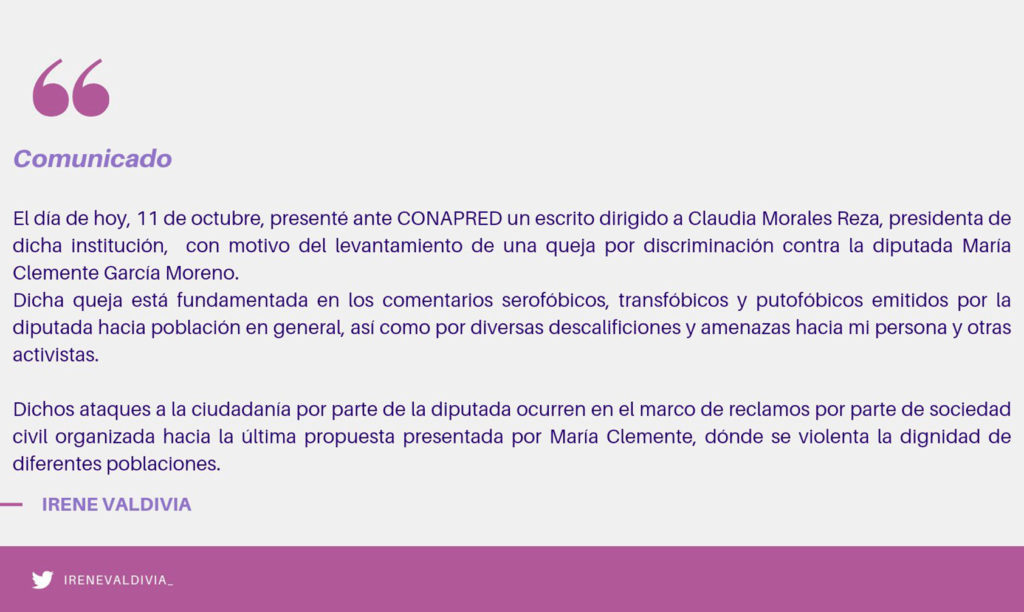 Mediante redes sociales, la activista dio a conocer el comunicado sobre que interpuso una denuncia en contra de Clemente García, por sus comentarios serofóbicos, transfóbicos y putofóbicos dirigidos a la comunidad en general, así como descalificaciones y amenazas hacia su persona.