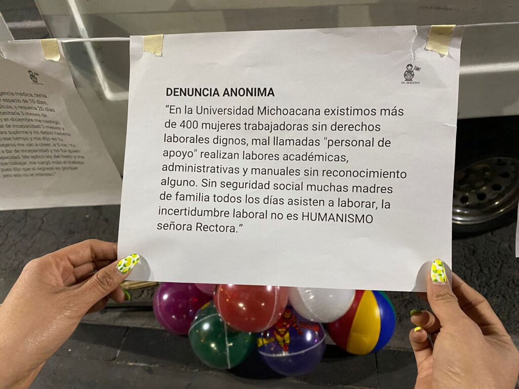 El tendedero permaneció en este lugar, donde se espera que más mujeres realicen las denuncias, en busca de generar mejores condiciones laborales en Michoacán.