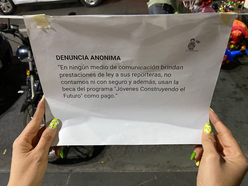 «En ningún medio de comunicación brindan prestaciones de ley a sus reporteras, no contamos ni con seguro y además, usan la beca del programa ‘Jóvenes Construyendo el Futuro’ como pago”, se lee en una de las denuncias.