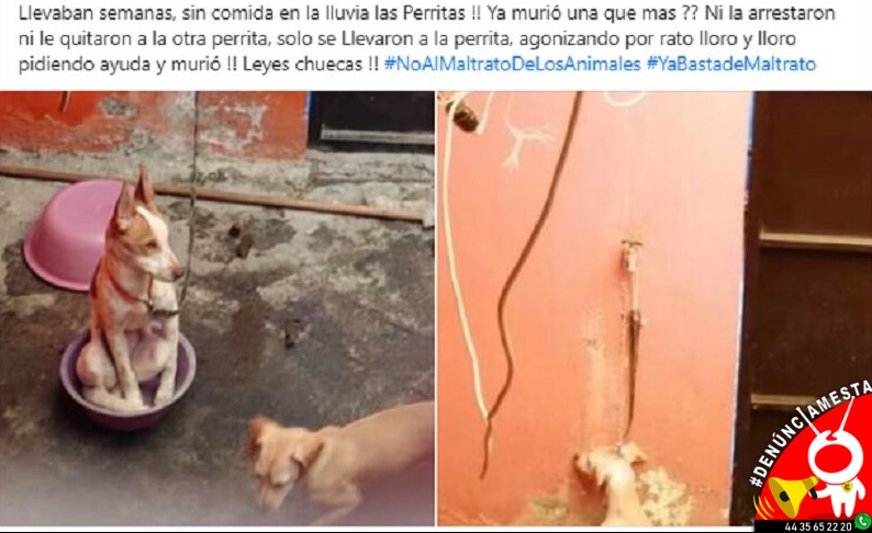 “Escuchamos desde temprano este miércoles los chillidos de la perrita que finalmente murió ahorcada porque el lazo de donde estaba amarrada era muy corto y en su desesperación se ahorcó. La intentamos salvar pero no se pudo” relata uno de los testimonios que señala que se procedió a llamar a rescate canino municipal, a Seguridad Pública, a la Fiscalía de Justicia y lo más que pudieron lograr fue que se les entregara el cadáver de la perrita fallecida.
