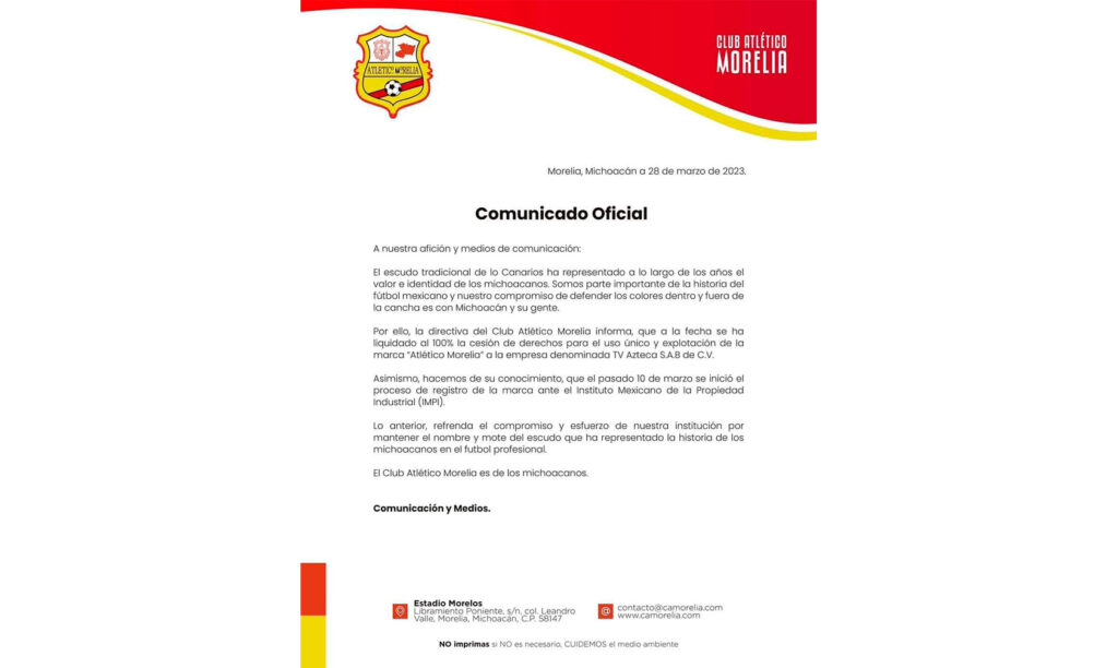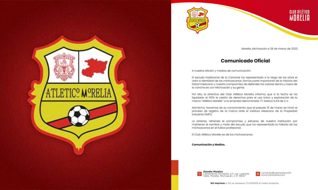 Hace unos momentos, con la expresión “Logrado” la directiva dio a conocer que ya liquidaron al 100 por ciento la cesión de derechos para el uso único y explotación de la marca “Atlético Morelia” a la empresa denominada TV Azteca S.A.B. de C.V.