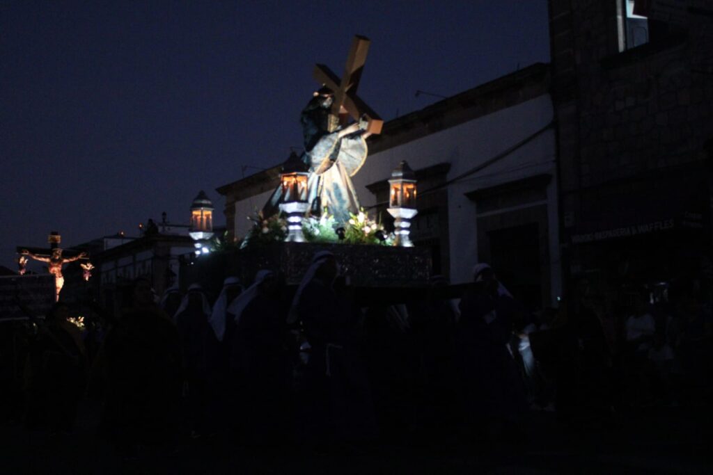 La noche ha caído, el Centro Histórico de Morelia se ha apagado por completo y la oscuridad se impone ante el paso de los tambores, en señal de duelo, y la audiencia a un costado de la avenida Madero sostiene veladoras encendidas, ha iniciado el ritual de la Procesión del Silencio para rendir luto a Cristo y el pésame a la Vírgen ante la crucifixión.