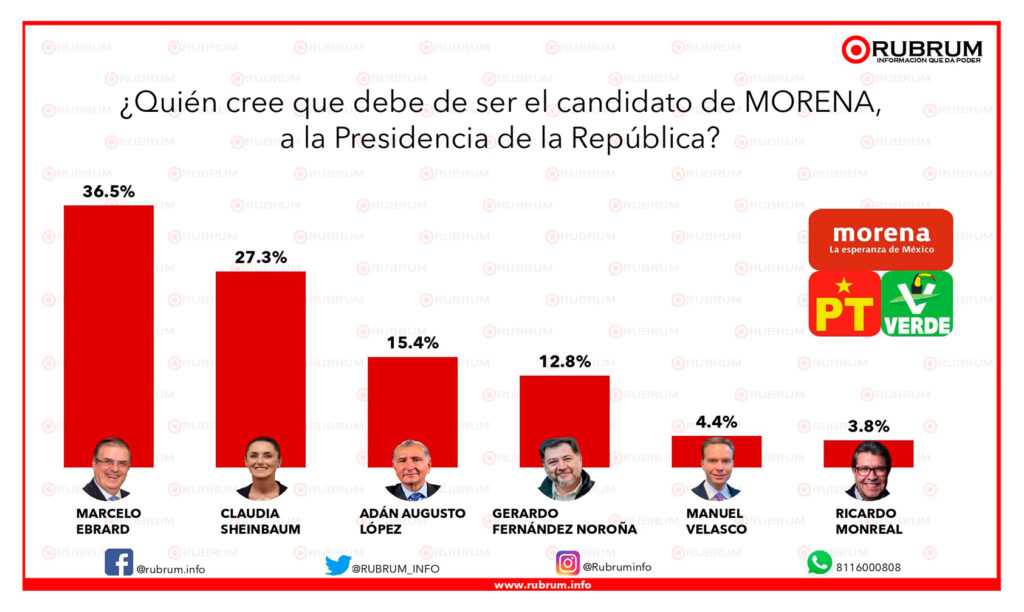 A su vez, Aguilar Calvo, señaló que la encuestadora Rubrum pone a Ebrard Casaubón con nueve puntos arriba de la única mujer que busca también ser la presidenciable de los marronistas, Claudia Sheinbaum Pardo. ( esta empresa obtuvo los resultados con la pregunta ¿Quién cree que debe ser el candidato de Morena, a la presidencia de la República? Misma que 27 fue publicada a través de sus sitios oficiales).