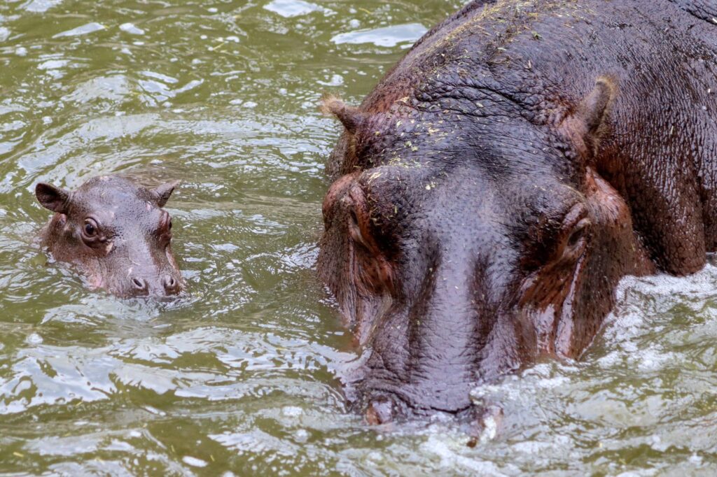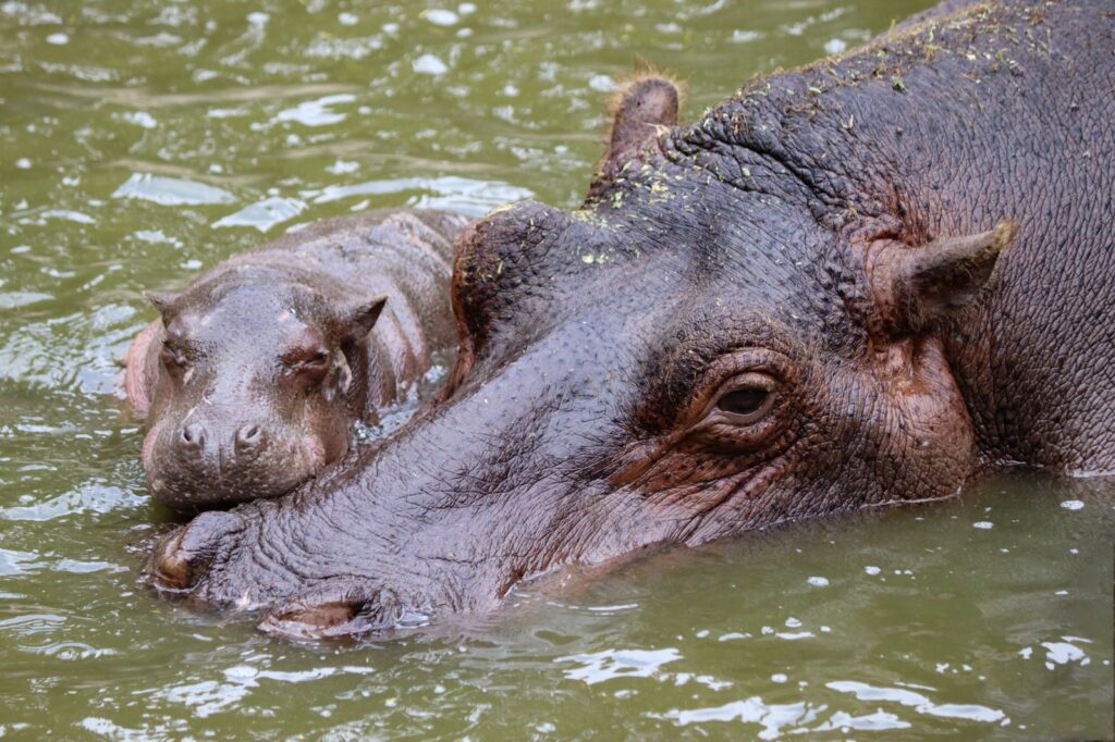 • Un hipopótamo bebé disfruta subiéndose a la espalda de su madre para descansar, y comenzará a comer pasto a las tres semanas de vida, aunque su mamá continuará amamantándolo durante aproximadamente un año.