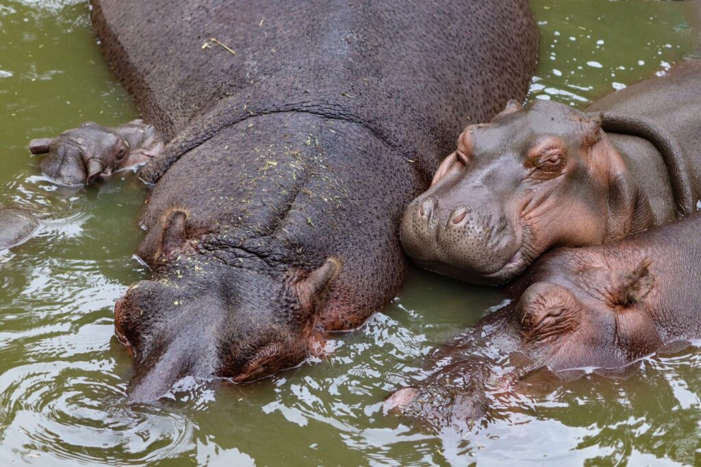 • Los hipopótamos recién nacidos siempre están protegidos por sus madres, y no sólo de depredadores como los cocodrilos o los leones, sino también de los hipopótamos machos que a veces intentan atacarles en el agua.