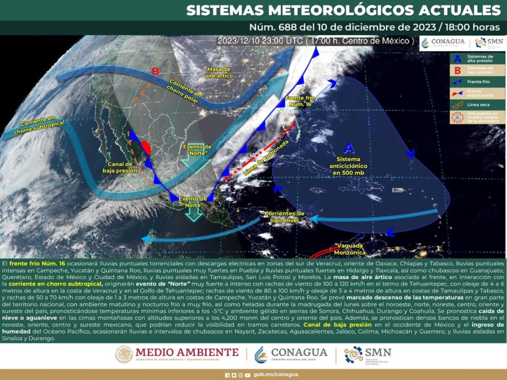 De acuerdo a pronósticos de la Comisión Nacional del Agua (Conagua), en las próximas horas se prevén temperaturas entre los 0 y 5 grados centígrados, además de lluvias, producto de un canal de baja presión.