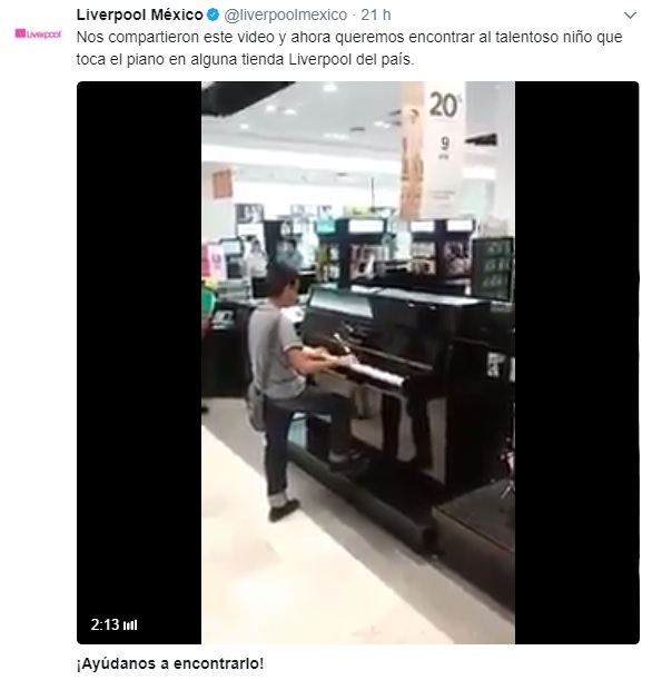 Nos compartieron este video y ahora queremos encontrar al talentoso niño que toca el piano en alguna tienda Liverpool del país. pic.twitter.com/vCmFK0O8q3