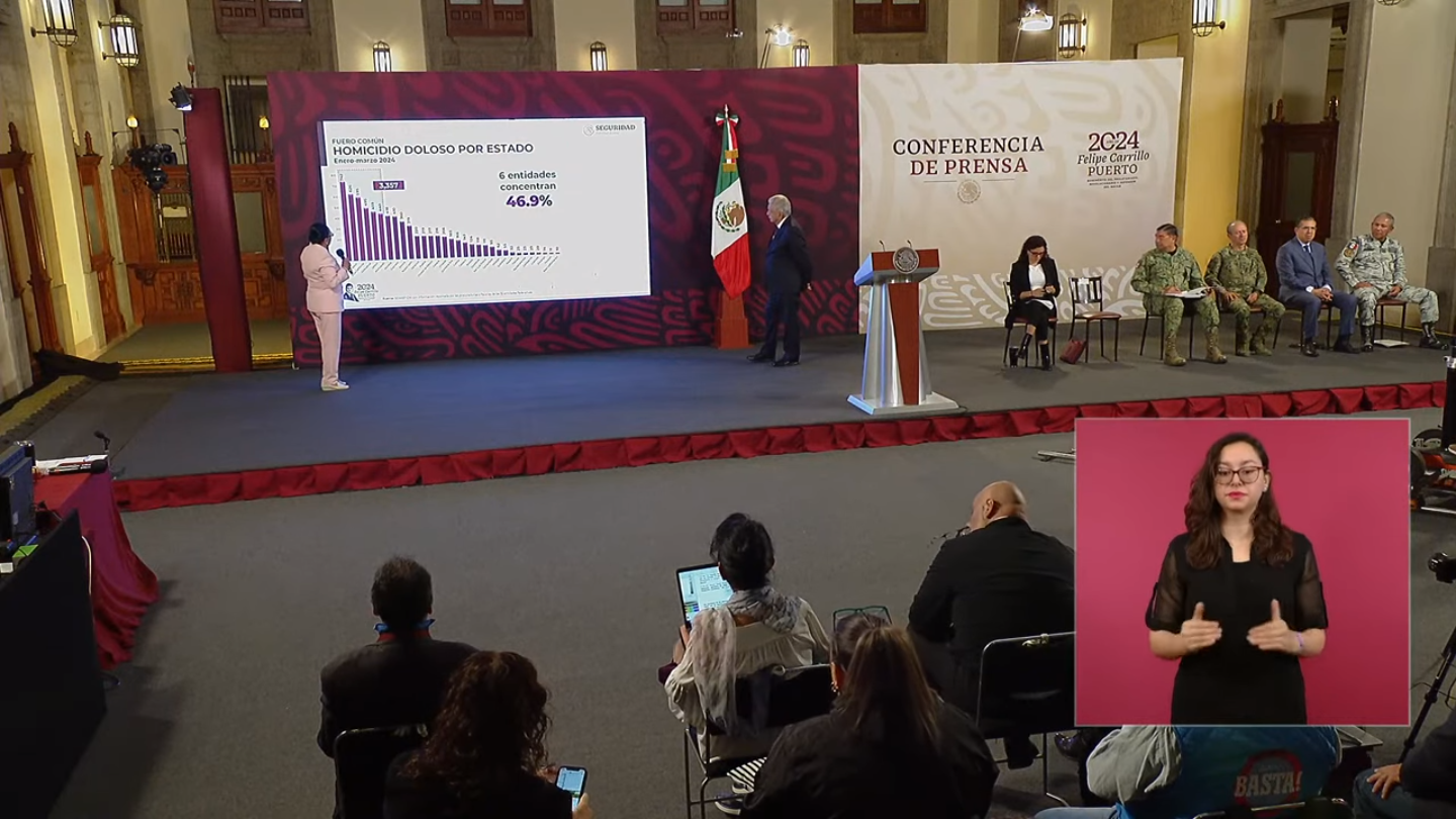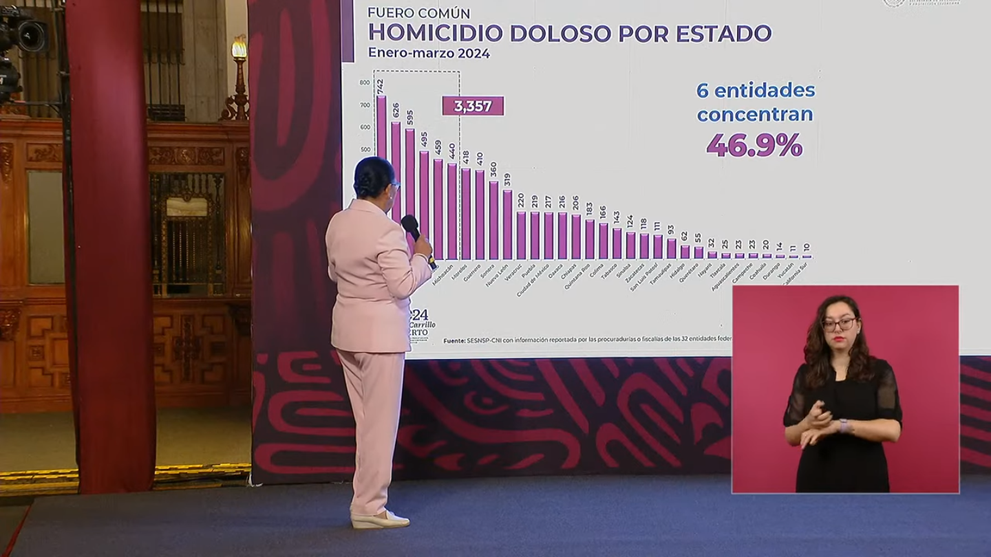 En cuanto a los estados en los que se han clasificado como las principales entidades con más incidencias por homicidios, la funcionaria federal mostró las gráficas de dicho delito, en donde Michoacán registró 440 homicidios, en los tres primeros meses del año 2024, por lo que se ubicó en la sexta posición.