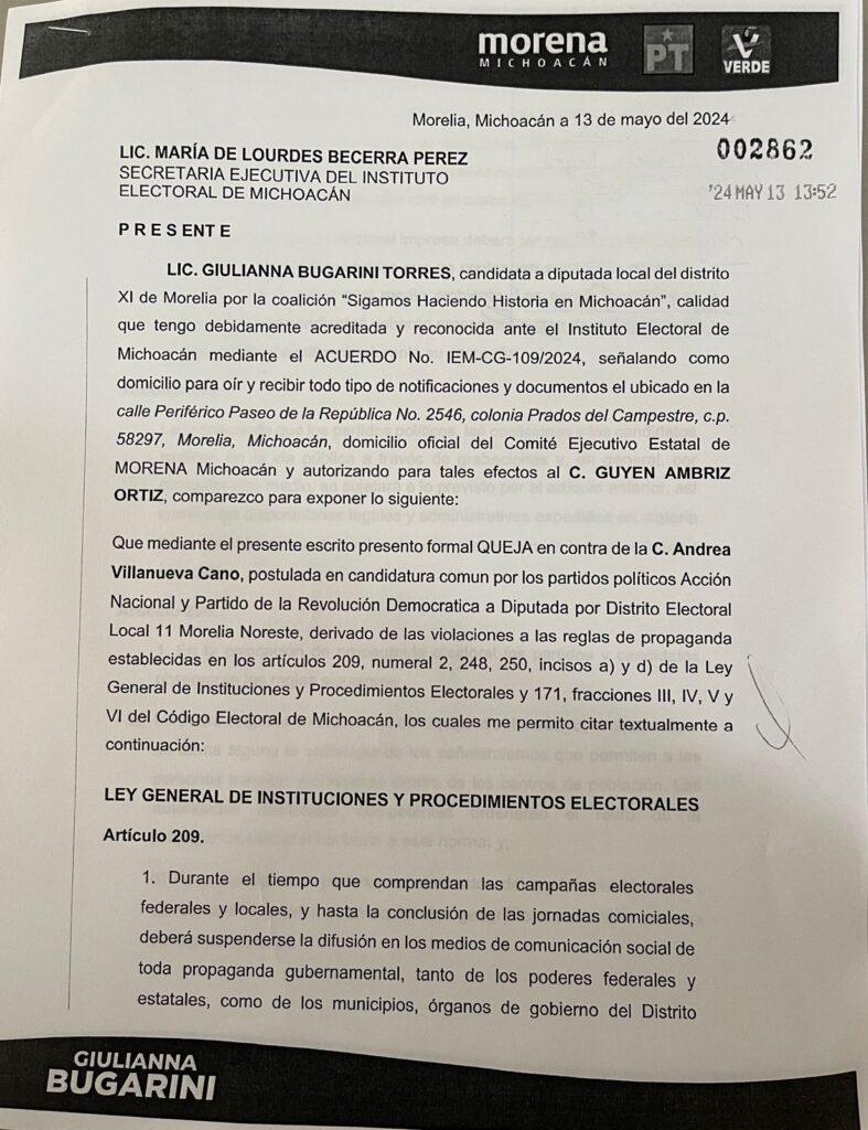 Ante las autoridades del Instituto Electoral de Michoacán (IEM), fue consignada una queja formal que responsabiliza a la diputada y aspirante a la reelección en el distrito 11 de Morelia, Andrea Villanueva, por la destrucción de propaganda electoral de MORENA, y de la candidata Giulianna Bugarini, al retirar propaganda del territorio para colocar propaganda en favor de la candidata del PAN.