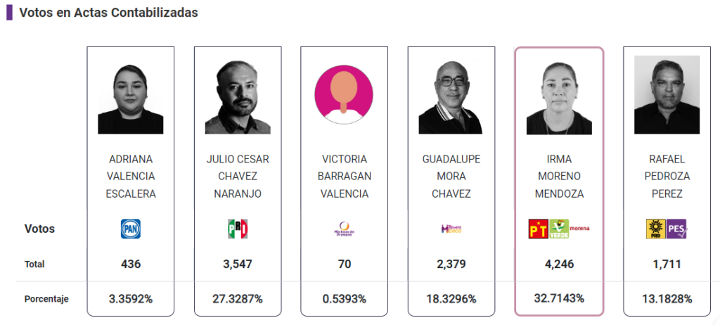 Lupe Mora, quien representó al partido emergente Tiempo X México, alcanzó un total de 2 mil 379 votos y una preferencia del 18.32% del electorado, lo que le valió un tercer lugar en lista de los seis aspirantes. Por su parte, la morenista obtuvo 4 mil 246 votos a su favor y un 32.71% de preferencia.