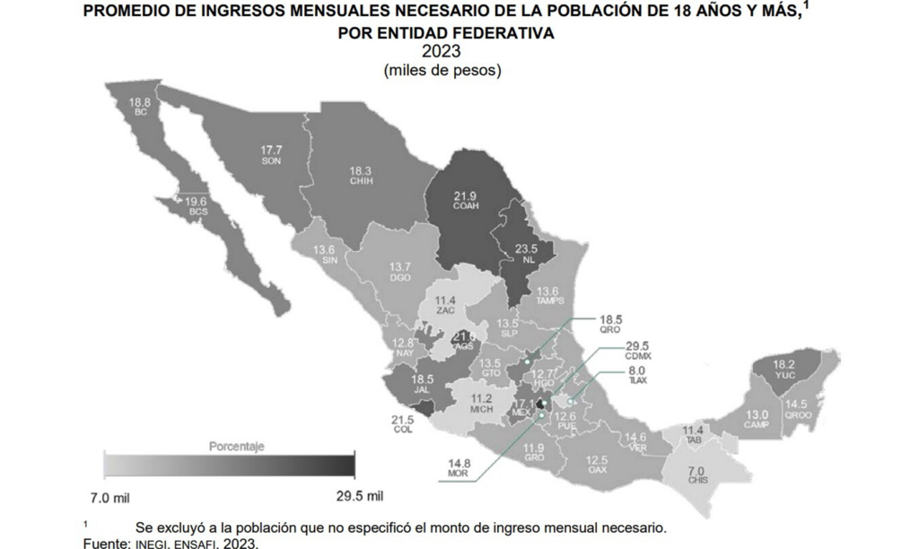 Por su parte, Ciudad de México es donde los mexicanos reportan necesitar un ingreso más alto para poder vivir. En parte puede deberse a los precios inmobiliarios, en parte a los precios de insumos, pero sin duda se trata de una cifra elevada respecto al resto del país: 29 mil 500 pesos.