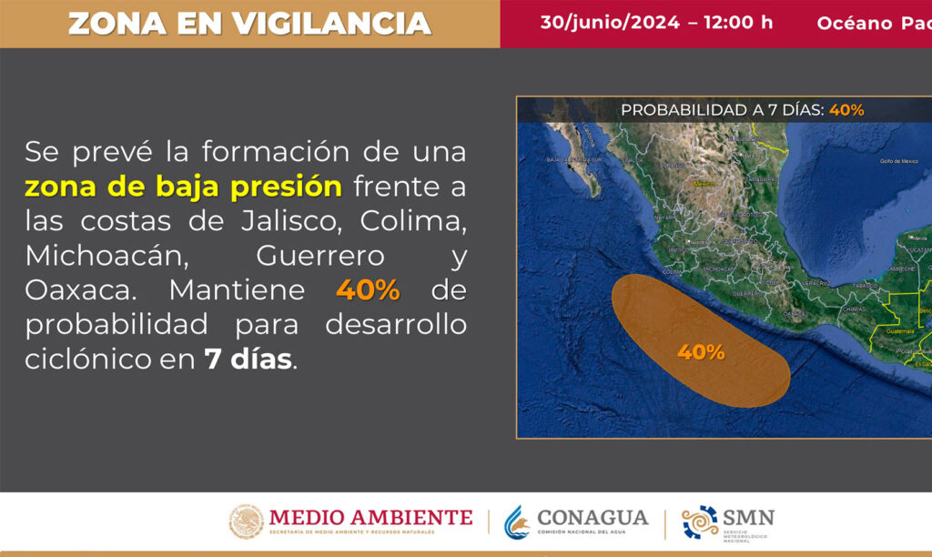 La Comisión Nacional de Agua (Conagua), informó de este pronóstico en el que apuntó que este canal de baja presión se incrementa en un 40% su probabilidad de desarrollarse a ciclón.