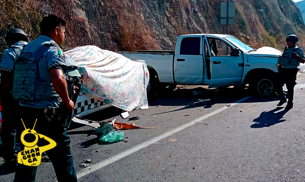 El aparatoso accidente se registró este jueves, a la altura del kilómetro 253+400, del tramo carretero Las Cañas – Feliciano, donde quedaron severamente dañadas, una camioneta Dodge tipo pickup, de color blanco y un auto Charger con balizamiento de la Guardia Nacional, unidad que fue cubierta con la sábana.