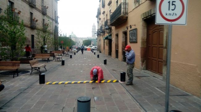 En aras de garantizar la seguridad de la ciudadanía, el Ayuntamiento de Morelia, mediante la Secretaría de Desarrollo Metropolitano e Infraestructura, continúa equipando la calle Ignacio Zaragoza del Centro Histórico de la ciudad, en esta ocasión con la colocación de topes de gaucho en esta vialidad semipeatonalizada.